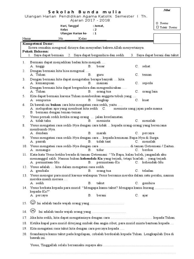 Soal mid agama katolik (sd) mid semester agama katolik. Rpp agama katolik smp kelas 7 semester 1. Tuhan menciptakan manusia secara unik, dalam rangka untuk …. Soal ujian agama katolik kelas 1 sd. Tetapi pada kesempatan ini saya akan melengkapinya dengan kunci jawaban.