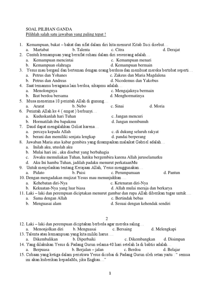 Berilah tanda silang x pada huruf a b atau c pada jawaban yang benar. Soal agama katolik kelas 4 Pdf soal agama katolik kelas 5 sd mid ganjil cedi nius academia edu. Contoh rpp daring pai sd kelas 1 semester 1 pai bp rpp sd july 26 2020 1518 untuk rekan rekan yang khususnya mengajar di jenjang sd mata pelajaran pendidikan agama islam dan budi pekerti kali ini admin akan berbagi contoh rpp daring pai sd kelas 1 semester 1. Agama islam ,,, adalah salah satu ilmu yang mempelajari tentang kebudaya dalam agama dan aqidah dan ahklak pada.
